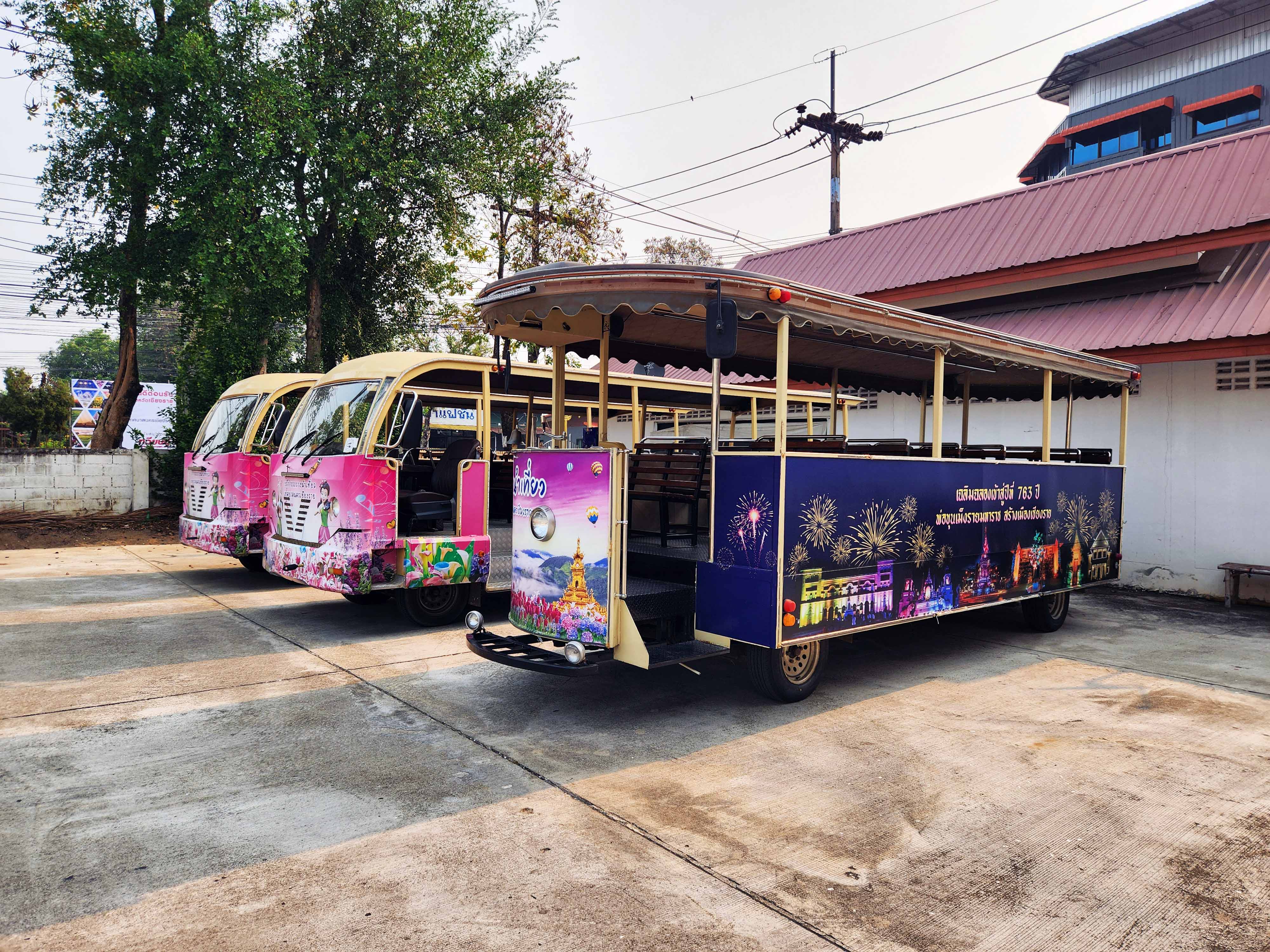 About: "Free City Tour by Tram" for visiting 9 Main Places in Chiang Rai's Downtown" and "Sky Walk Doi Saken" is a campaign to promote city tourism and offer the tour daily around in Chiang Rai City (9:30 / 13:30). Get there 30 mins in advance to reserve at Tourist Information Centre (Agricultural Market Chiang Rai) Just 10 minutes walk (650m) from OUR HOSTEL! Trams leave every day from 5 persons or more only.