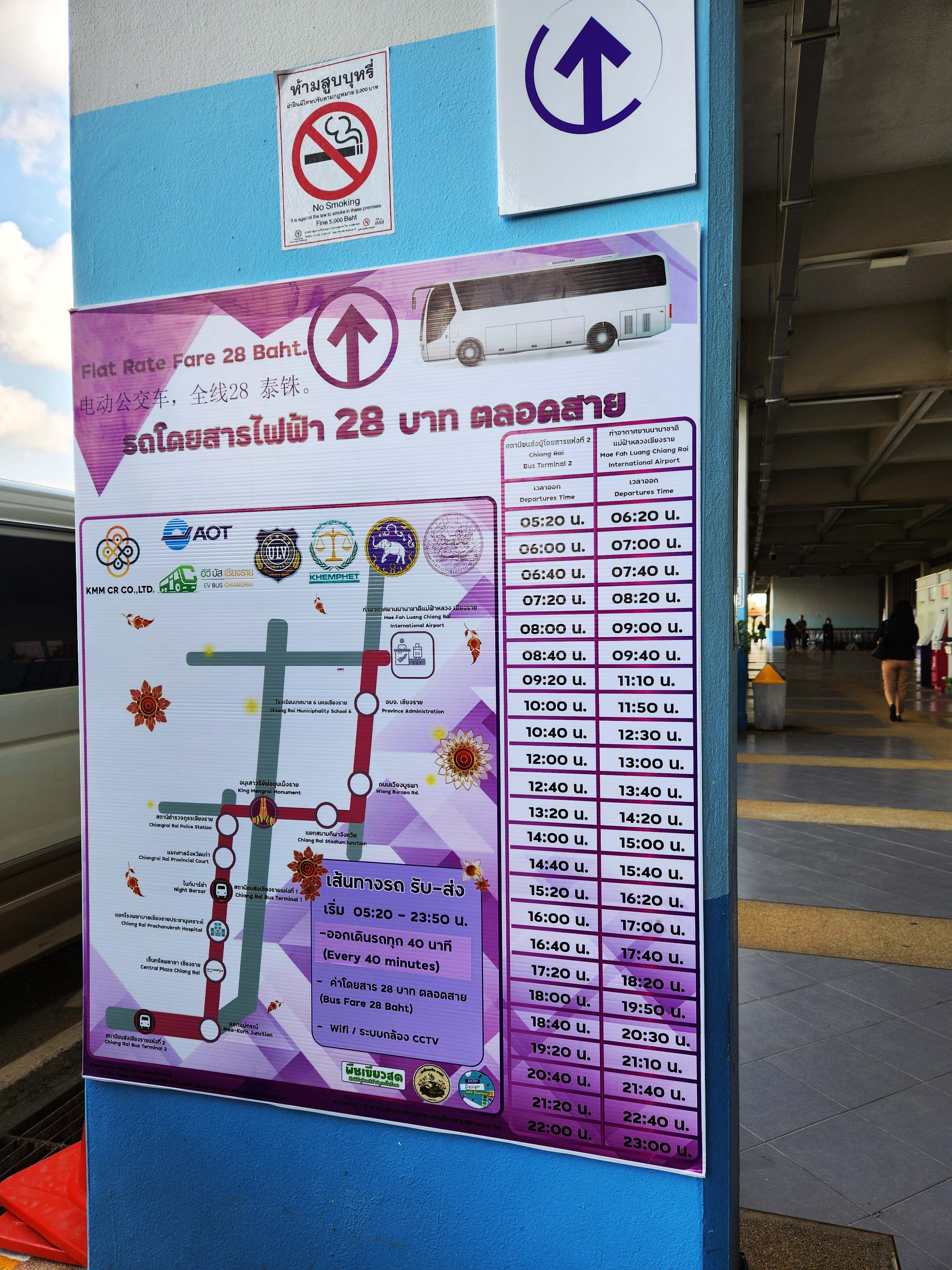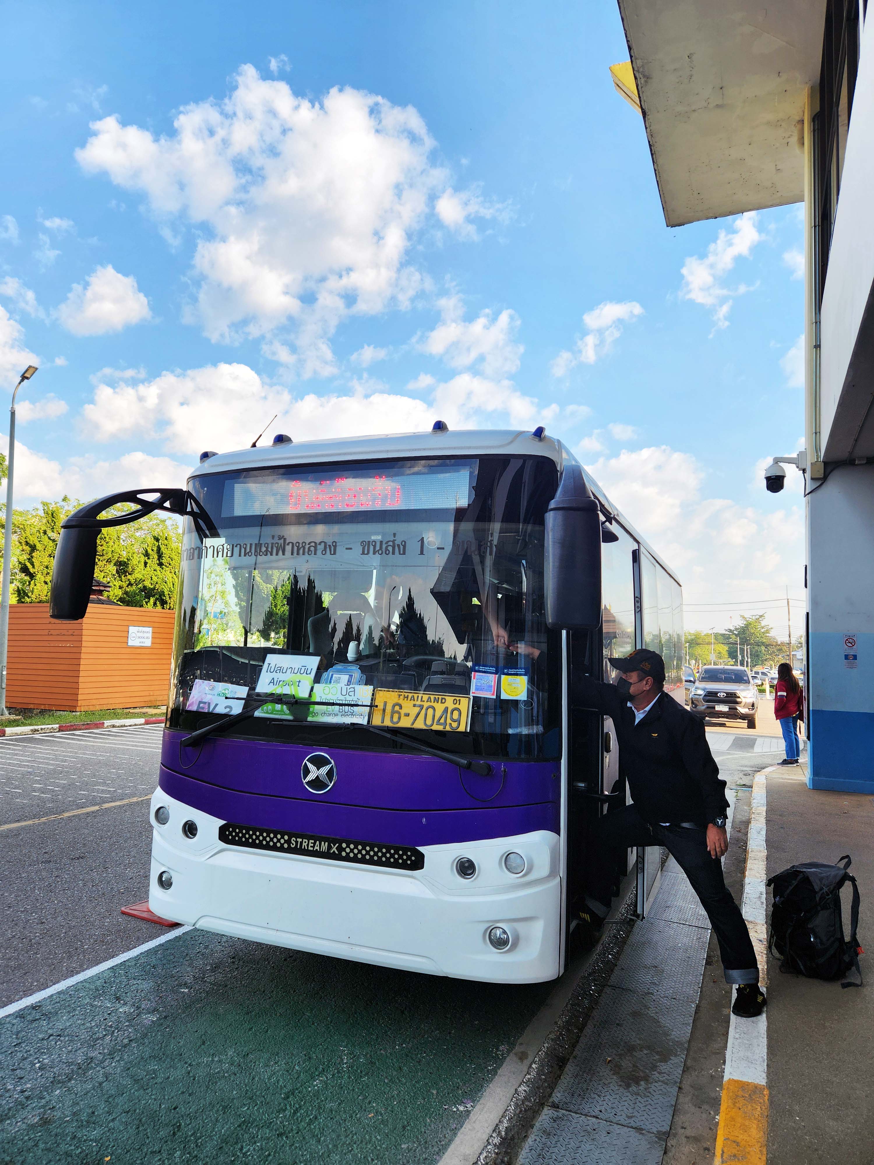 บริการขนส่งสาธารณะจากสนามบินกลับมาเปิดให้บริการอีกครั้งตั้งแต่ต้น ธันวาคม 2566 ที่ผ่านมา โดยสถานีรถบัสจะอยู่ปีกขวาของอาคารผู้โดยสารขาเข้าเมื่อคุณออกไปข้างนอก โดยคิดค่าบริการ 28 บาท ตลอดสาย แวะจอดทั้งหมด 10 จุดรับส่ง รวมทั้งที่อนุสาวรีย์พ่อขุนเม็งราย (จุดจอดที่ 4) ซึ่งผู้โดยสารสามารถขอลงที่ถนนศรีเกิด หน้า บ้านไม้กระดานโฮสเทล รถบัสยังวิ่งผ่านจุดแวะสำคัญ เช่า สถานีขนส่ง1 ไนท์บาร์ซ่า เซ็นทรัลพลาซ่าเชียงราย และไปสิ้นสุดที่ สถานีขนส่ง 2