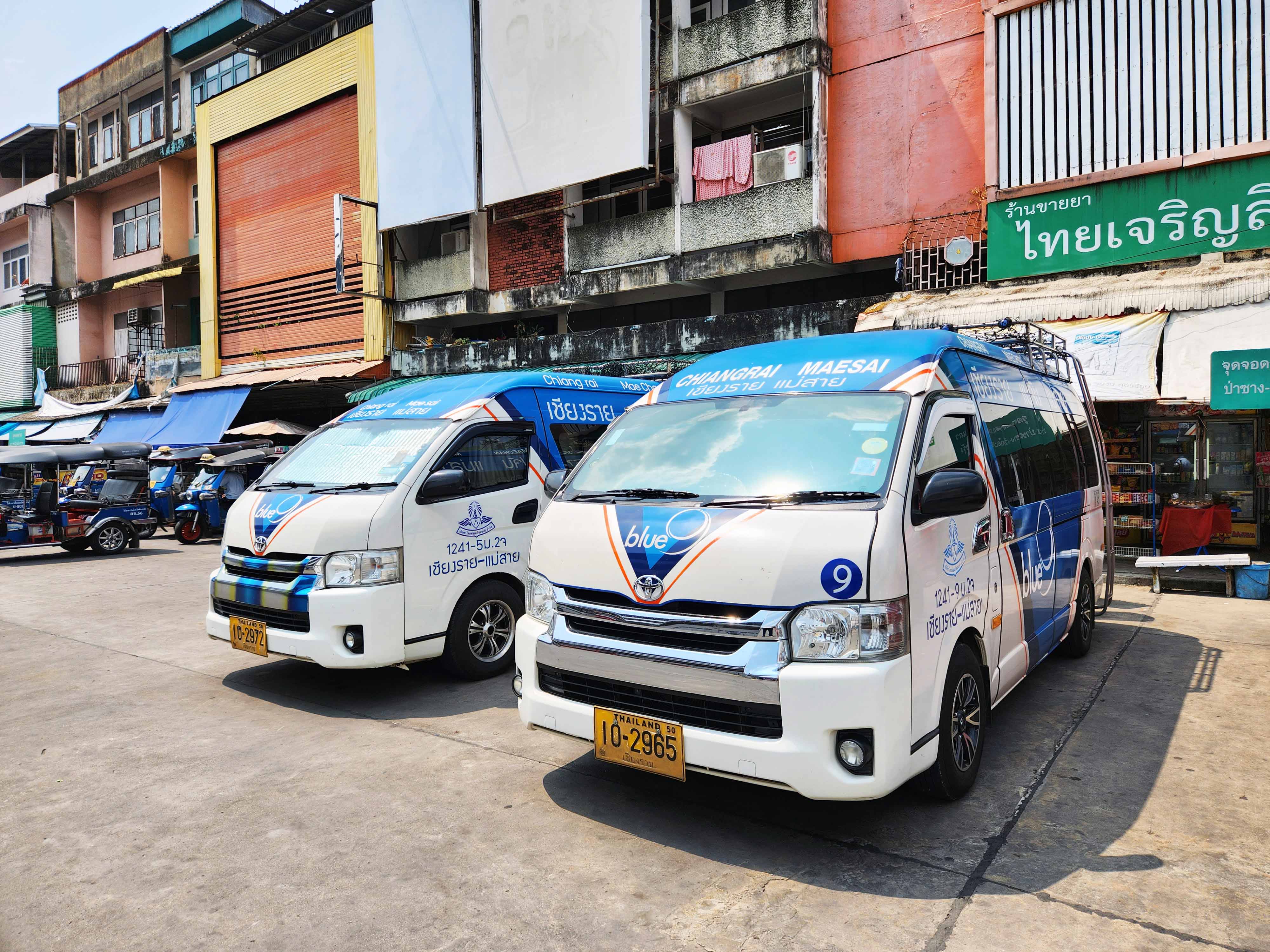 นอกจากรถเมล์แล้วยังมีรถตู้บริการไปแม่สาย ขึ้นรถเลยที่จอดรถปิคอัพสีฟ้าไปอีกหน่อย