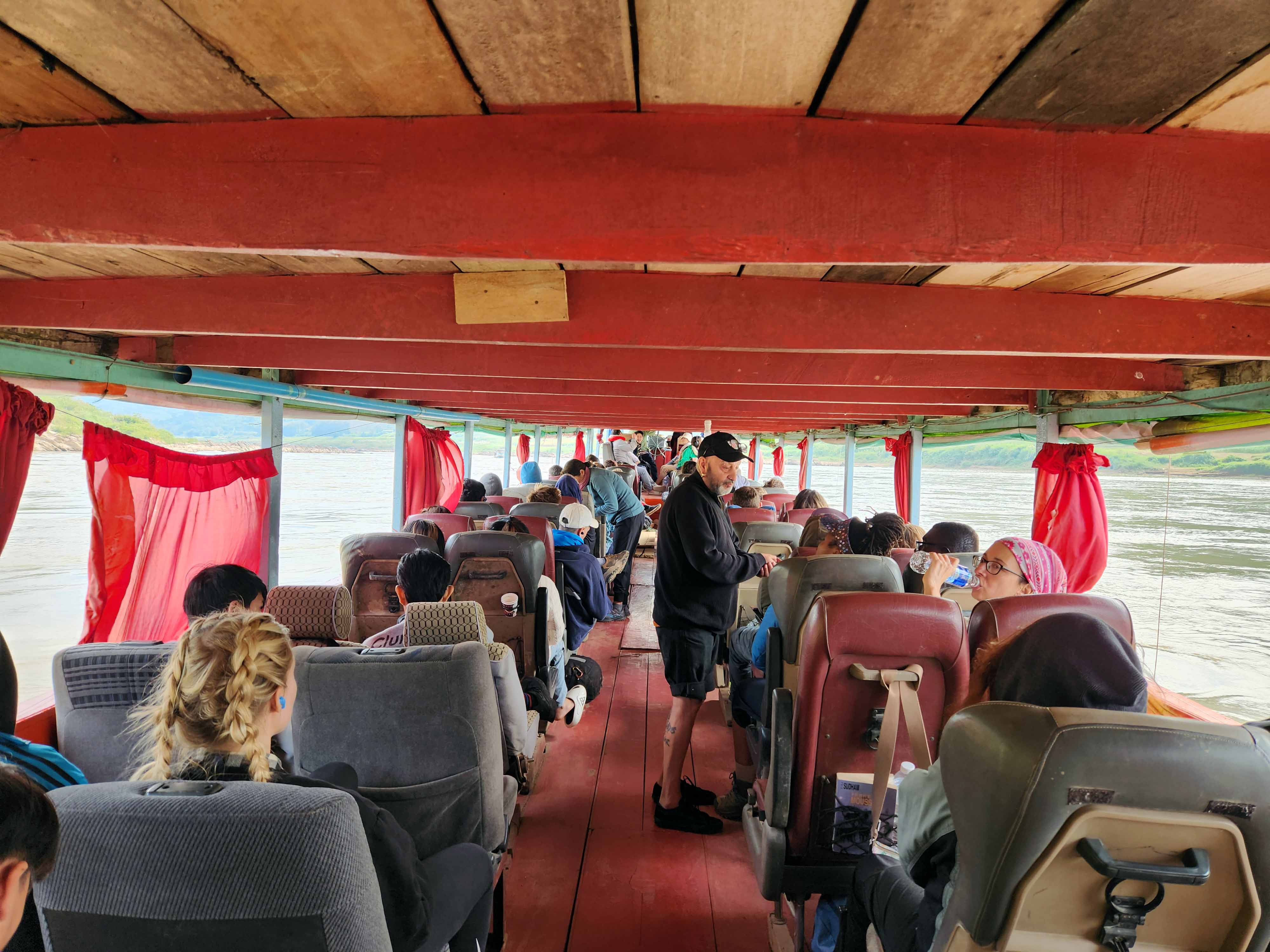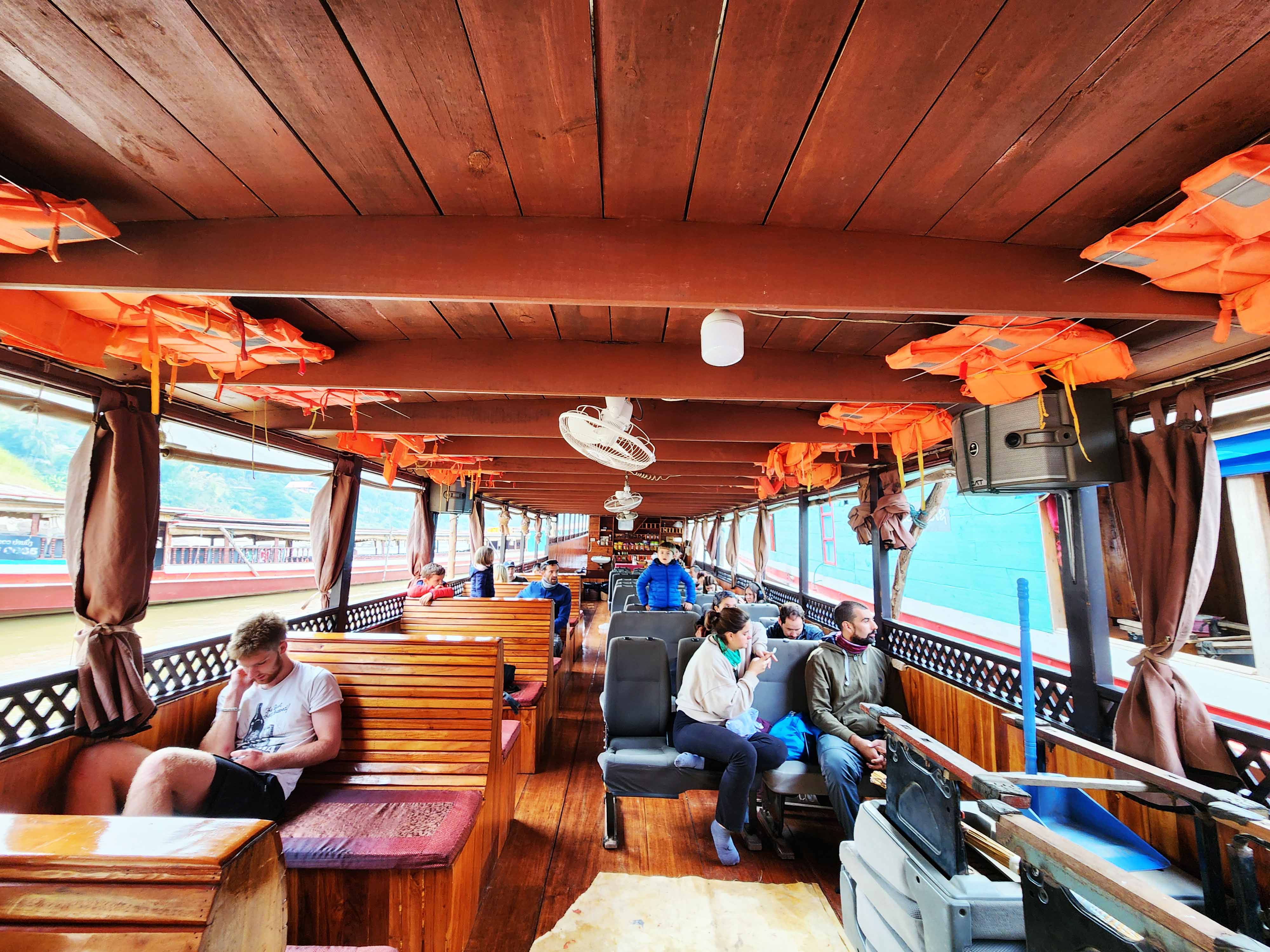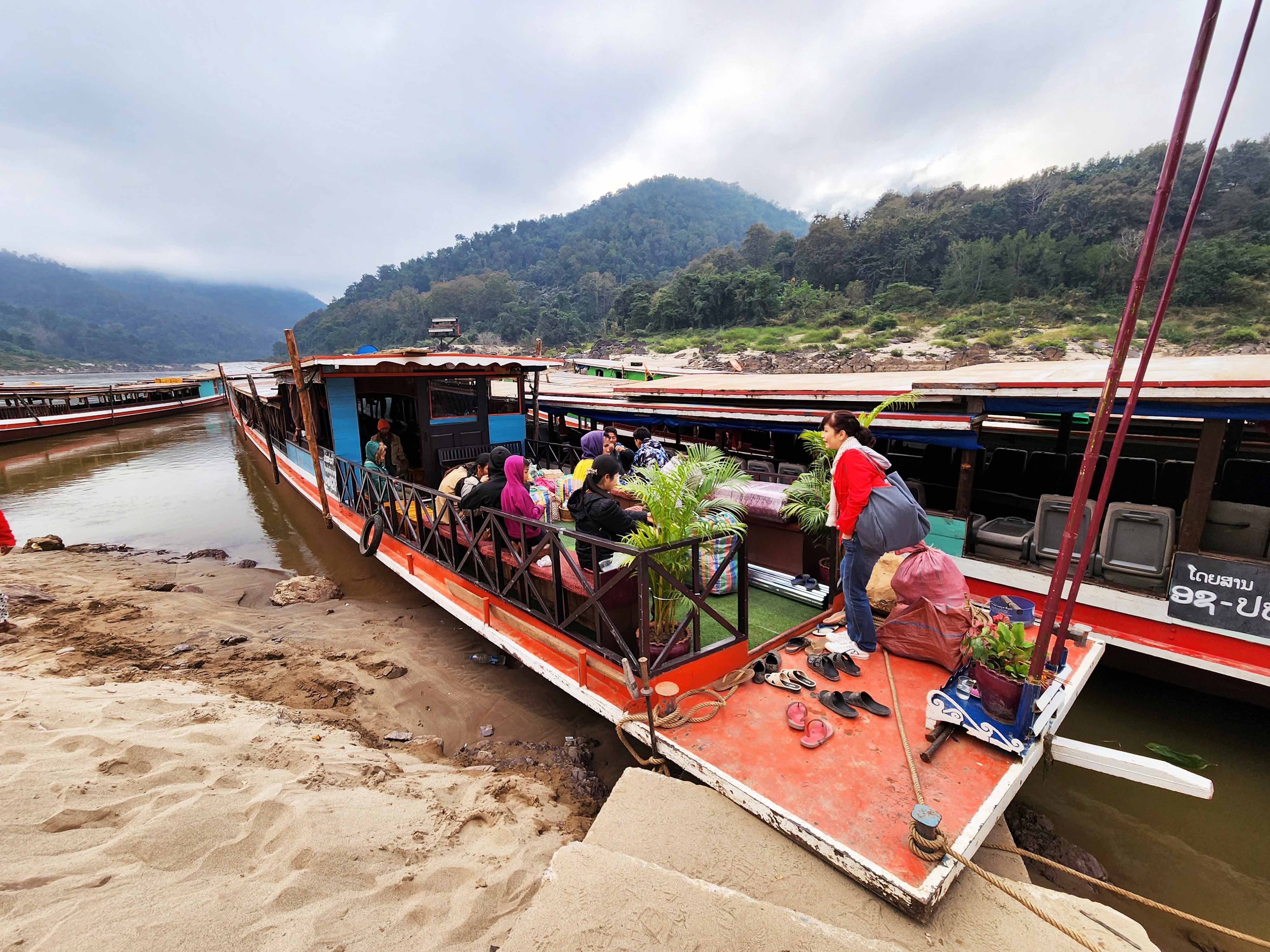 2. หลังจากผ่านจุดตรวจหนังสือเดินทางฝั่งลาวที่ห้วยทราย (Huay Xai) นักท่องเที่ยวสามารถไปขึ้นรถรับส่งที่จอดรอด้านหน้าอาคาร เพื่อเดินทางไปที่ท่าเรือ ก่อนขึ้นเรือจะมีเวลาประมาน 30 นาที ในการซื้ออาหารและเครื่องดื่มสำหรับมื้อเที่ยงระหว่างเดินทาง โดยแพคเกจเดินทางจะรวมแซนวิช หรือข้าวจี่ ซึ่งเป็นขนมปังยาวมีไก่อบหรือปลาทูน่า ทานเป็นมื้อเช้าช่วงรอขึ้นเรือ โดยการเดินทางจะใช้เวลาประมาน 7 ชม. เรือมีที่นั่งแบ่งเป็น 2 ฝั่งเพียงพอสำหรับผู้โดยสารทุกคน (ไม่มีการระบุเลขที่นั่ง) ระหว่างทางก่อนถึงปากแบง (Pak Beng) เรือมีแวะรับส่งคนโดยสาร 3-4 แห่ง ตลอดทาง 2 ฝั่งมีทัศนียภาพสวยงาม