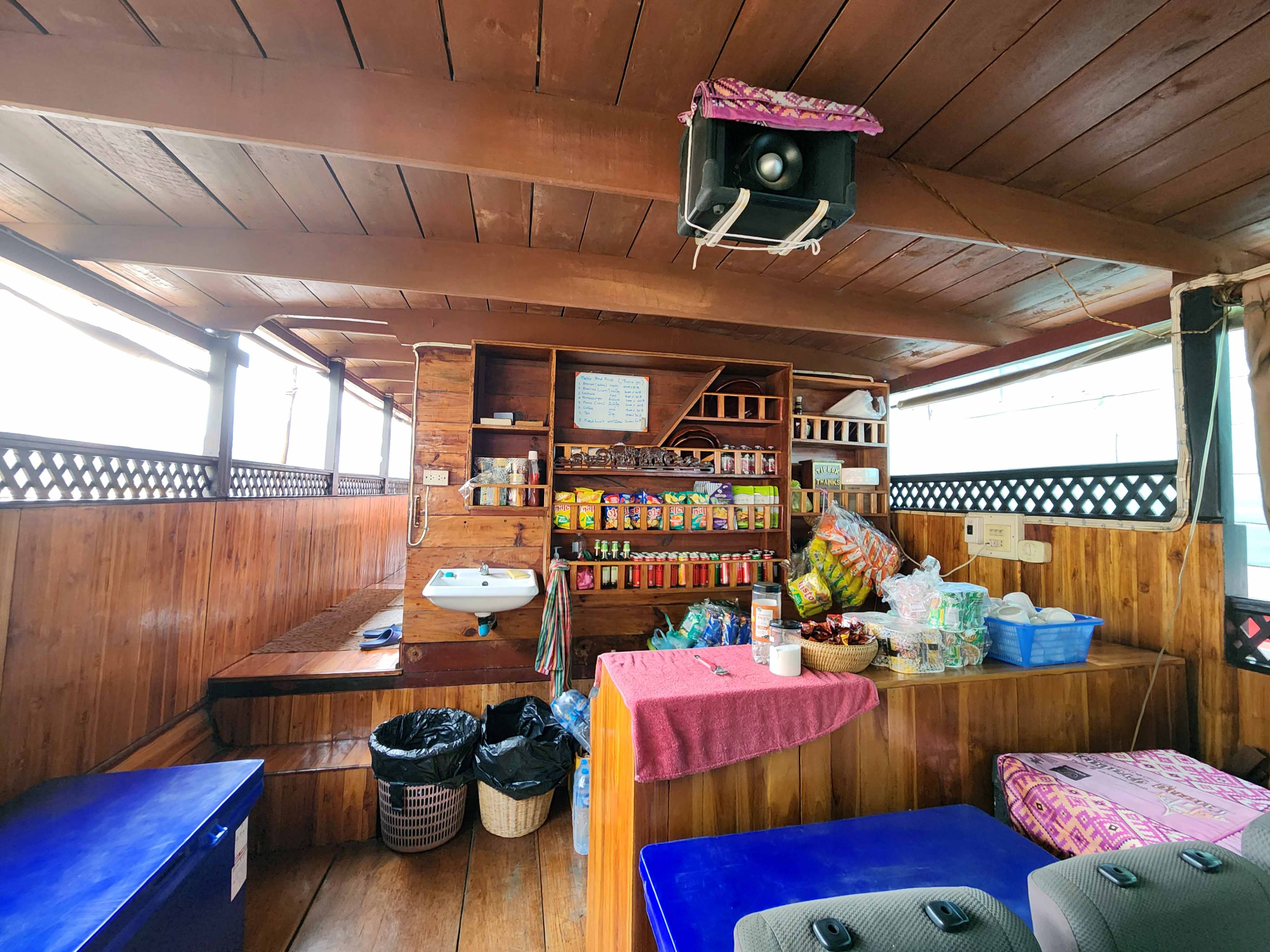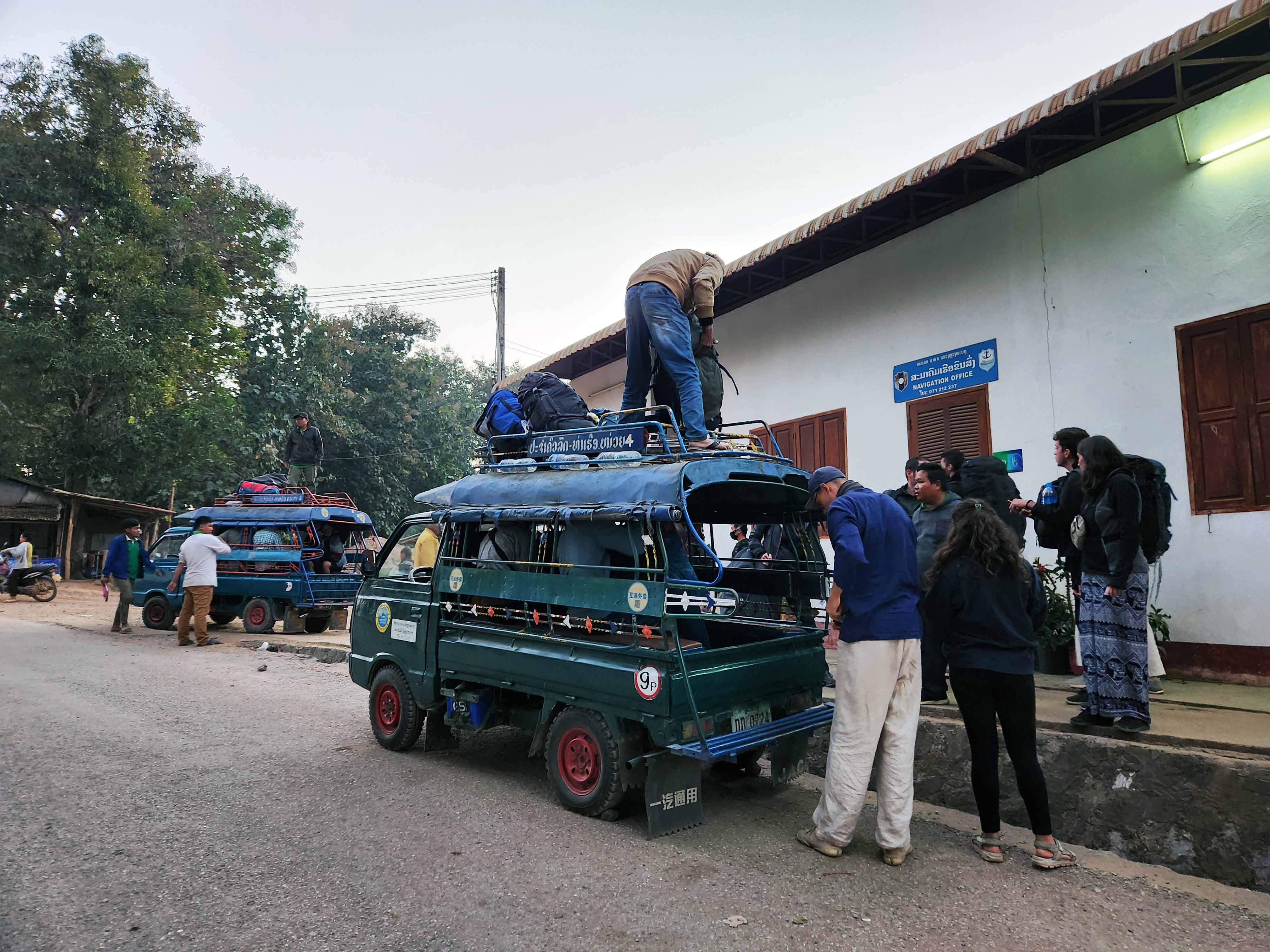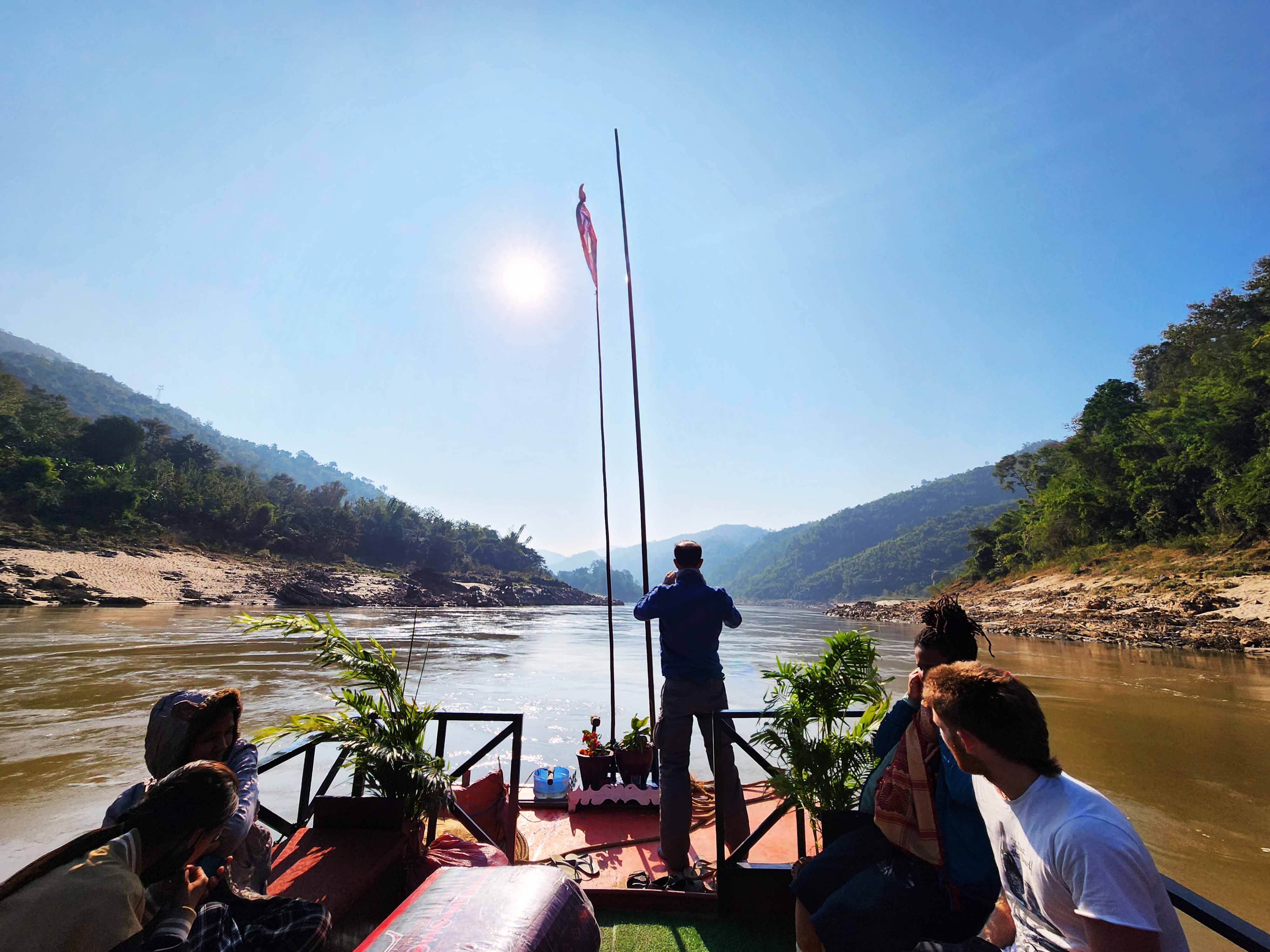 2. หลังจากผ่านจุดตรวจหนังสือเดินทางฝั่งลาวที่ห้วยทราย (Huay Xai) นักท่องเที่ยวสามารถไปขึ้นรถรับส่งที่จอดรอด้านหน้าอาคาร เพื่อเดินทางไปที่ท่าเรือ ก่อนขึ้นเรือจะมีเวลาประมาน 30 นาที ในการซื้ออาหารและเครื่องดื่มสำหรับมื้อเที่ยงระหว่างเดินทาง โดยแพคเกจเดินทางจะรวมแซนวิช หรือข้าวจี่ ซึ่งเป็นขนมปังยาวมีไก่อบหรือปลาทูน่า ทานเป็นมื้อเช้าช่วงรอขึ้นเรือ โดยการเดินทางจะใช้เวลาประมาน 7 ชม. เรือมีที่นั่งแบ่งเป็น 2 ฝั่งเพียงพอสำหรับผู้โดยสารทุกคน (ไม่มีการระบุเลขที่นั่ง) ระหว่างทางก่อนถึงปากแบง (Pak Beng) เรือมีแวะรับส่งคนโดยสาร 3-4 แห่ง ตลอดทาง 2 ฝั่งมีทัศนียภาพสวยงาม